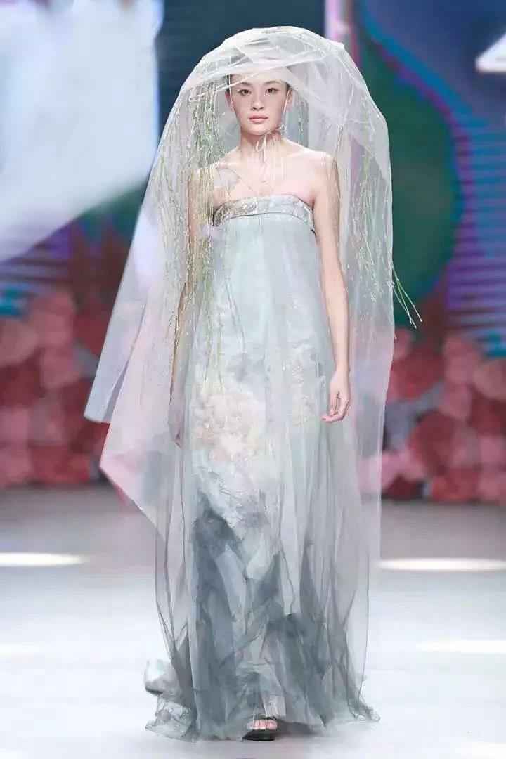模特身着轻纱叠透,头带斗箩杨柳,由远处缓缓走来,墨荷摇曳,幻雅生姿,逸风清扬,翩然于飞。完美的展现东方美的想像空间和灵动性。